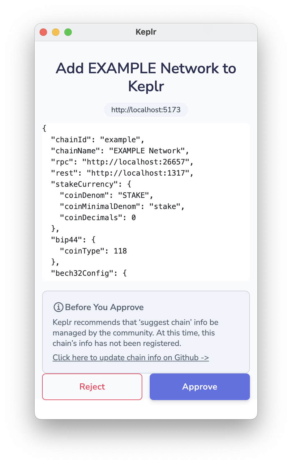 Press "Connect wallet", enter your password into Keplr and press "Approve" to add your blockchain to Keplr.